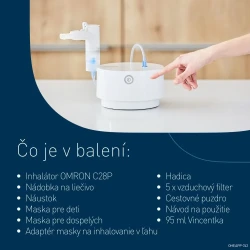 Balenie obsahuje: Kompresorový inhalátor OMRON C28P (C105), nádobku na liečivo, hadicu, náustok, masku pre dospelých, masku pre deti, adaptér masky na inhalovanie v ľahu, 5 vzduchových filtrov, cestovné puzdro, návod, 95 ml Vincentka na inhalovanie