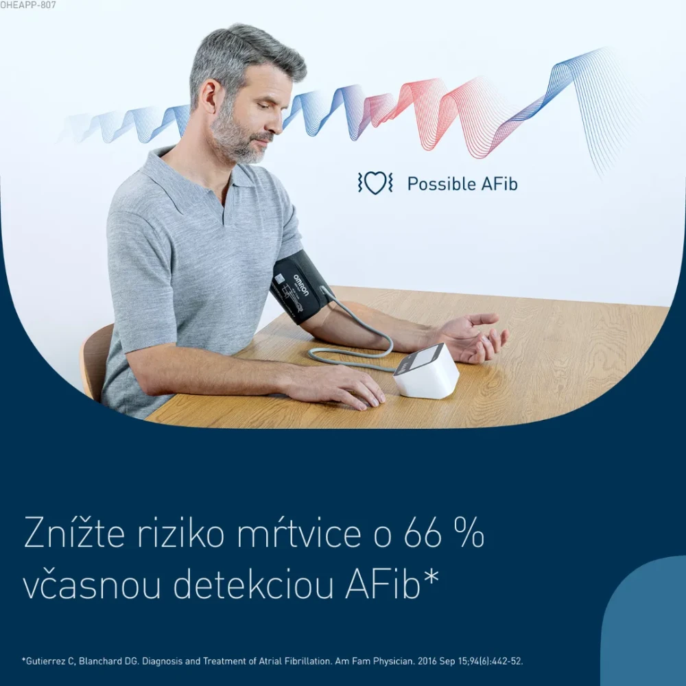 - funkcia Intellisense AFib - detekcia fibrilácie predsiení už z jedného merania. Jedinečný algoritmus poháňaný AI teraz rozpoznáva aj náznaky AFib. Presnosť novej technológie OMRON bola testovaná s 12 zvodovým EKG. Tlakomery OMRON s technológiou IntelliSense AFib mali citlivosť 95,1%, špecificitu 98,6% a presnosť 97%. To je v porovnaní so zariadeniami iných značiek priaznivejšie.