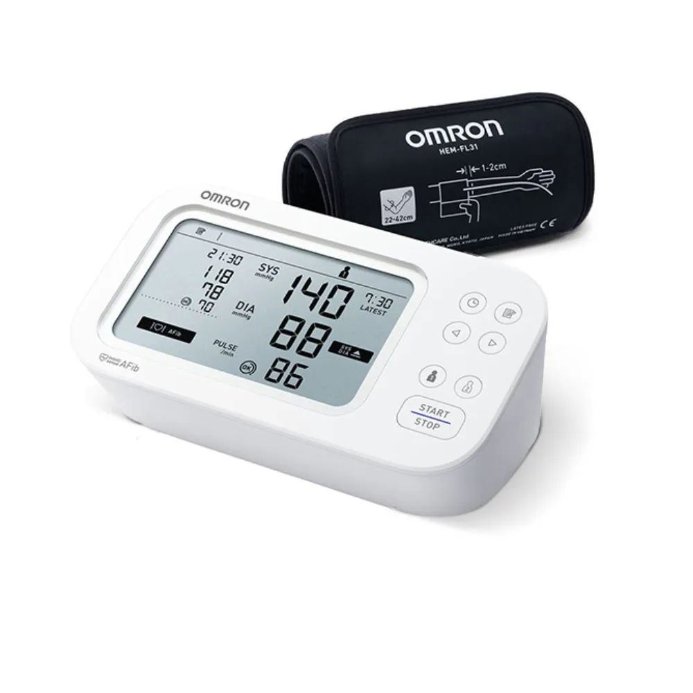 - funkcia Intellisense AFib - detekcia fibrilácie predsiení už z jedného merania. Jedinečný algoritmus poháňaný AI teraz rozpoznáva aj náznaky AFib. Presnosť novej technológie OMRON bola testovaná s 12 zvodovým EKG. Tlakomery OMRON s technológiou IntelliSense AFib mali citlivosť 95,1%, špecificitu 98,6% a presnosť 97%. To je v porovnaní so zariadeniami iných značiek priaznivejšie.